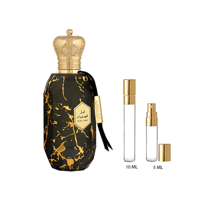 Desert Night es una fragancia majestuosa que se despliega como una brisa del desierto. Comienza con un toque picante de pimienta rosa y la frescura aromática del olíbano y el aceite de naranja, este perfume da paso al reconfortante aroma dulce de la canela. En su base, la fragancia se asienta en las notas terrosas de haba tonka, ámbar, madera de cedro, pachulí, sándalo y cuero, combinados con el aroma sensual del haba tonka.